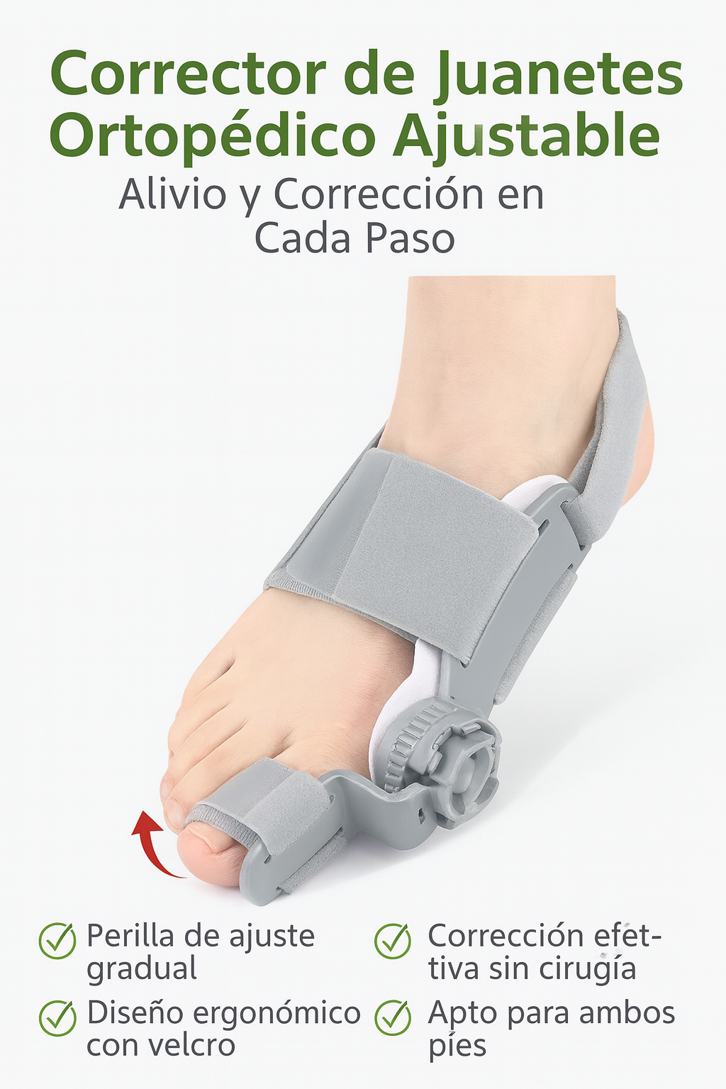 ¿Sufres de dolor, inflamación o incomodidad por juanetes? Este Corrector de Juanetes Ortopédico Ajustable está diseñado para alinear el dedo gordo, reducir el dolor y prevenir deformaciones mayores, sin necesidad de cirugía.